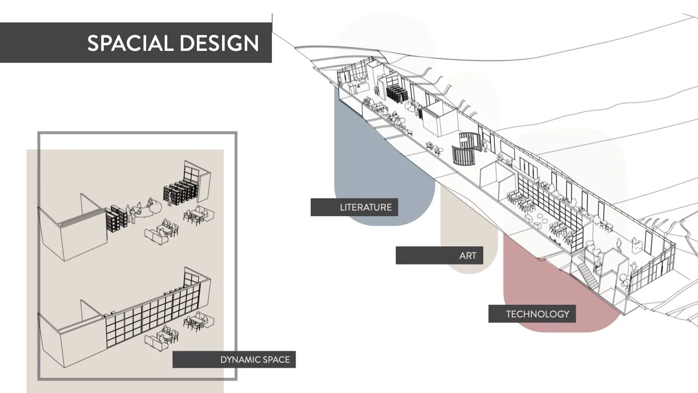 I strived to create a library that spanned across the river bordering the area, creating easier access to a college campus on the other side. The building and surrounding land was all modeled in Rhino 3D. The model itself is designed to be naturally cooling and follows the technical design specifications for water capture systems. I later transferred the curves to Adobe Illustrator to create technical